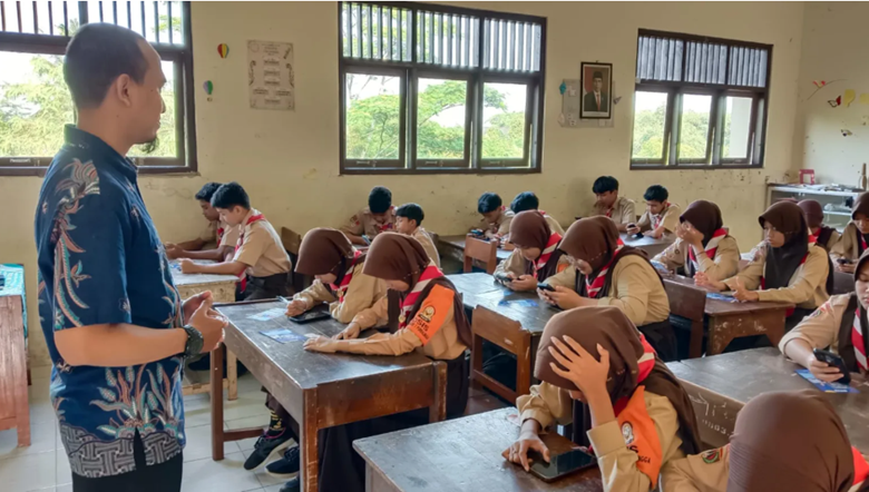 Manager Genza Purbalingga, Irwan Arbi, S.Si sedang mengawasi try out tes TKA di SMPN 3 Purbalingga. (Foto: Prasetiyo/EDUKATOR)